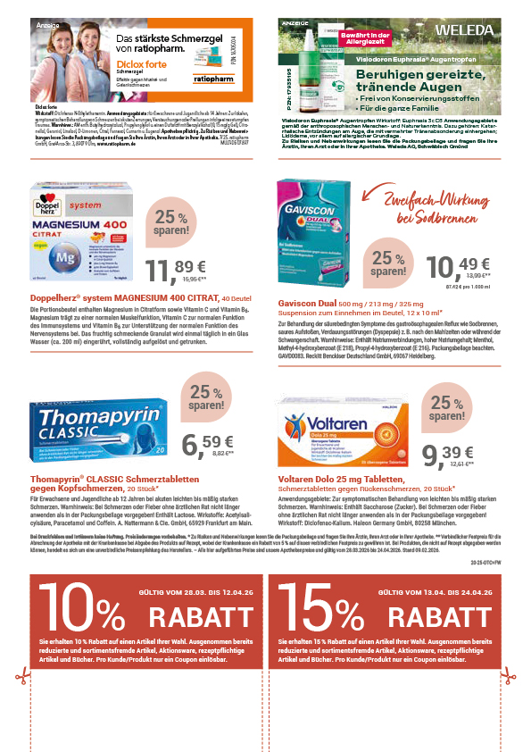 Jeden Montag und Mittwoch erhalten Sie 15 % Rabatt auf unser gesamtes vorrätiges Kosmetik-Sortiment.